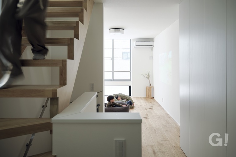 守口市の「都市に棲む家」とほぼ同じ間口ですが、守口で建てた家はご夫婦のみがお住まいになる家でした。今回はお子様が2人いるので、ご家族4人がどれだけ快適に住まえるかを追求した住まいとなりました。周囲が建物に囲まれているため、3階にトップライト(天窓)を設け、吹き抜けや階段から光を家全体に取り込めるようにしました。また、物をきっちりしまえるよう、使い勝手を考え、必要な場所に必要な収納スペースを設けました。そうすることで、LDKや寝室など十分な広さを確保。家族4人が明るく愉しく快適に住まえる家になりました。