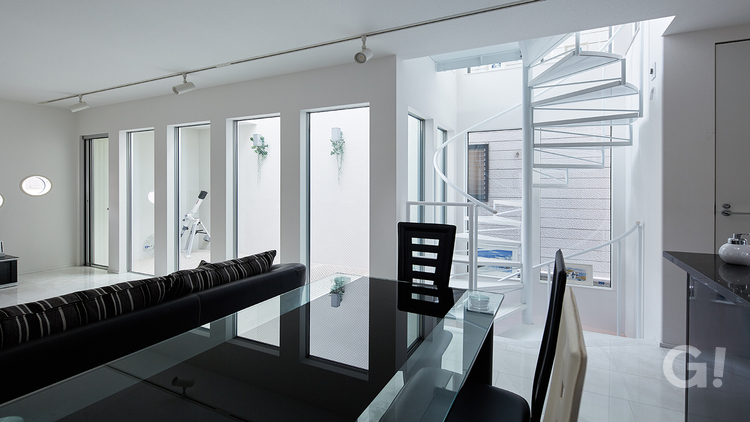 白い床や壁にしたり、吹抜けを設けたり、螺旋階段を採用することで敷地19坪・延床27坪を感じさせない開放感を実現しました。