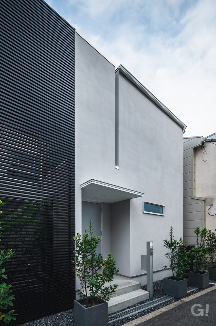 都市部で周囲を建物に囲まれた中に佇む住まい。