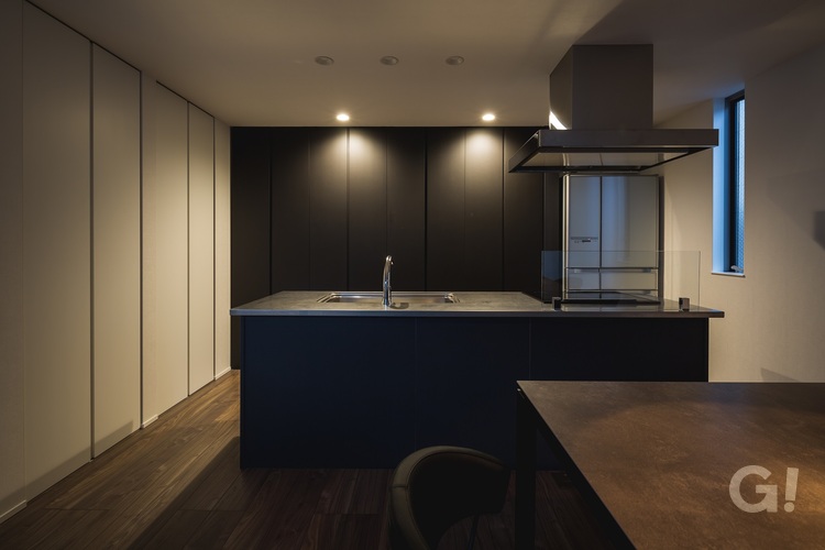 プライバシーを守れるように外観は閉鎖的ですが、1階のエントランスホールや2階LDKからも太陽の光や緑を感じられる豊かで開放的な空間としました。中庭と外部を格子でつなぐことで、外観デザインのアクセントになるだけでなく、外壁の圧迫感を抑えつつ、風の通り道にもなっています。シンプルな家事動線のアイランドキッチン、収納力たっぷりの壁面収納、各居室にあるウォークインクローゼット、ゆるやかな勾配のストリップ階段など、ご家族全員が毎日家に帰るのが楽しみになる、そんな住まいを計画しました。