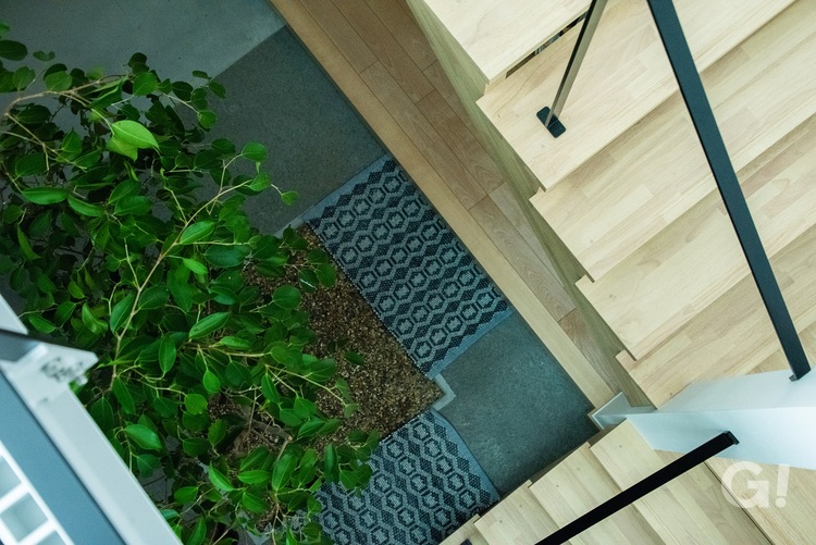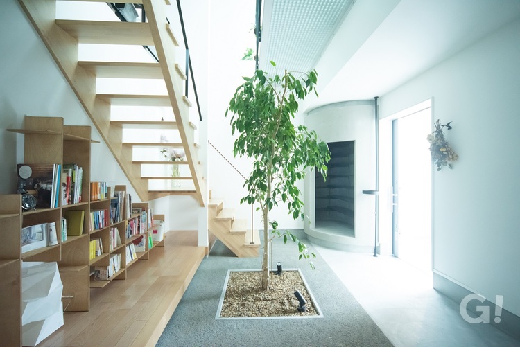 「家の中に緑がある家っていいですよね」というお施主様の一言からはじまった「木と共生する家」。玄関を入ってまず目に飛び込むのが家の中に植樹した大きな木です。LDKは2階。木を眺めながら階段をのぼったり、階段から木に霧吹きで水をかけたり。ナチュラルな暮らしを実現した大胆な設計の家です。