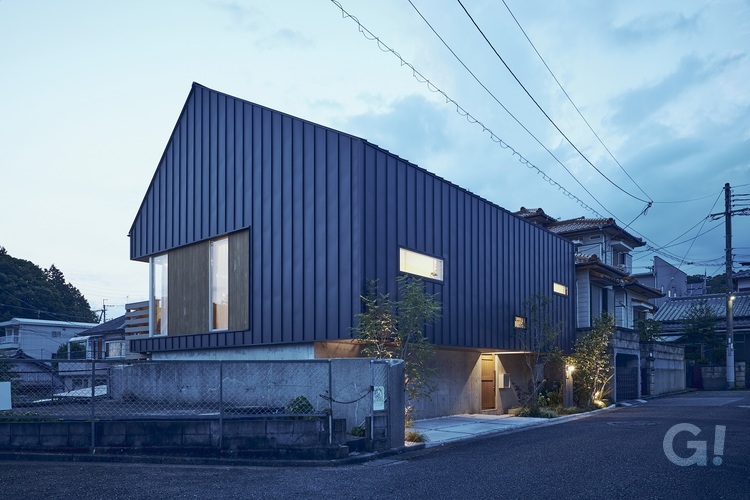キャンチレバーで跳ね出した建物の下をくぐり、外部階段を上がって玄関のある中庭へアクセスする個性的なアプローチ。2階建てでありながら、道路レベルの1層目、中庭・玄関等1階フロアとなる2層目、そして寝室がある2階フロアの3層目、と敷地高低差を活かした3層構成になっています。中庭を取り囲む、外に閉じ内に開く空間構成は外部からの視線を完全に遮断しながら、家のどこにいても中庭が眺められる、開放性とプライバシーを兼ね備えものにしています。オーク無垢床が印象的なリビングには、木板仕上げの大きな吹抜けを配し、中庭と連続性を持たせることで心地良さが際立つようにしています。中庭にはカツラの樹を植樹し、お子様とともに成長する過程を温かく見守っています。時間の経過とともにお施主様の色に馴染んでいく…そんな住まい手に寄り添った心地良い住宅になりました。