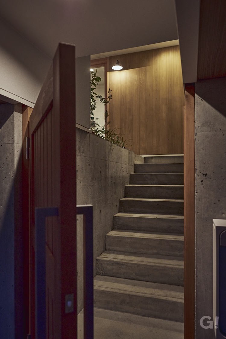 キャンチレバーで跳ね出した建物の下をくぐり、外部階段を上がって玄関のある中庭へアクセスする個性的なアプローチ。2階建てでありながら、道路レベルの1層目、中庭・玄関等1階フロアとなる2層目、そして寝室がある2階フロアの3層目、と敷地高低差を活かした3層構成になっています。中庭を取り囲む、外に閉じ内に開く空間構成は外部からの視線を完全に遮断しながら、家のどこにいても中庭が眺められる、開放性とプライバシーを兼ね備えものにしています。オーク無垢床が印象的なリビングには、木板仕上げの大きな吹抜けを配し、中庭と連続性を持たせることで心地良さが際立つようにしています。中庭にはカツラの樹を植樹し、お子様とともに成長する過程を温かく見守っています。時間の経過とともにお施主様の色に馴染んでいく…そんな住まい手に寄り添った心地良い住宅になりました。