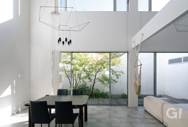 白い外壁(光壁)に反射させた光を室内に多く取り入れられるので、昼間は電気をつけなくても十分に明るい空間になりました。