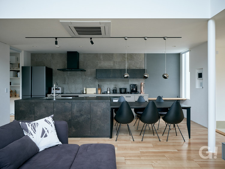 好きな家具や照明に囲まれてとても優雅な雰囲気になっています。大きく吹き抜けたリビングは、開けた庭とその先の自然にも開放しており、のびのびと遊び育つ子育て環境として、とても良い効果があるのではと思います。また大人にとっても子ども心を忘れずにいられる素敵な住宅でとなっています。