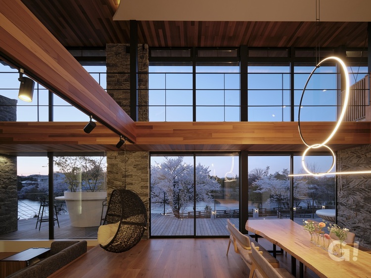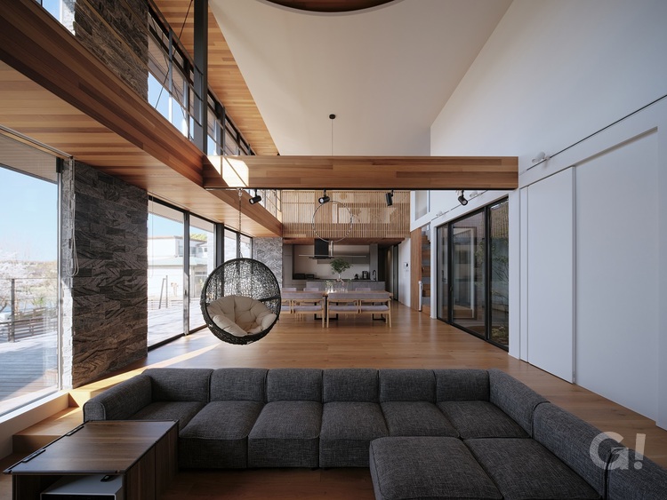 LDKは約40帖の大空間で、リビング・ダイニング全てを吹き抜けにしています。木造軸組工法における最大級のスパンです。2階の渡り廊下を構造的な補強としていますが、単に補強として設けるのではなく大開口のガラスを眺望方向に連続させて、渡り廊下も歩くだけで楽しくなるような空間にしました。