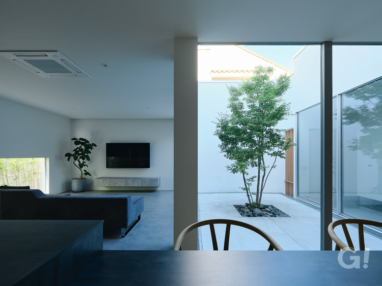 建築へ大きな期待を寄せてくださるご夫妻とのコラボレーションは、その情熱までを組み込んだ完成度高い「作品」となった。 “心動かす空間” の創出に力を注ぎ、足すのではなく引き算で、用途や間仕切りをそぎおとして”中庭” を効かせ、建築美を追求した。 造形と素材にこだわり、細部まで吟味した家具選びも、本建築を美術館に来たような感覚へと誘う一助となっている。