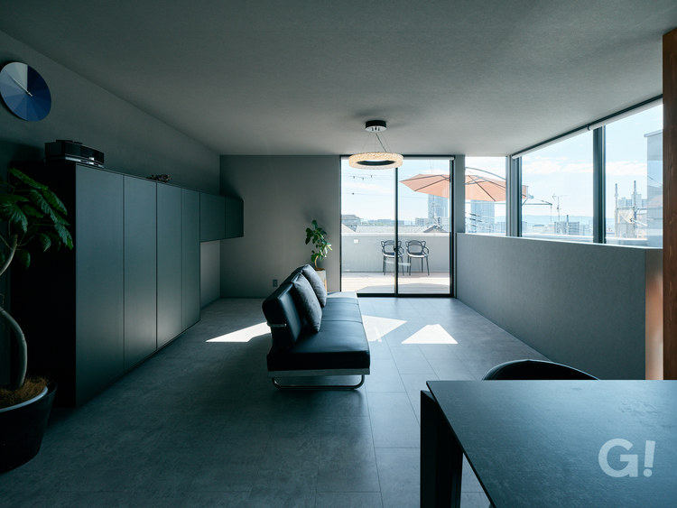 一般的に一邸の中には色々なトーンのグレーが使われていて、例えば外壁のグレーは内壁のグレーとは違うグレー、内装の巾木や窓台、建具など部材ごとに少し違うグレーが混ざり合うことになります。しかしK様邸ではそれらを極限まで統一したひとつだけのグレーにすることにこだわった建築であり、内外の壁の連続性もそれゆえ各段に上がっています。
