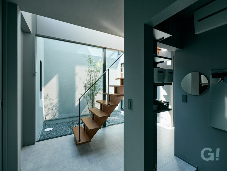特に中庭で内外連続性が顕著に感じられます。1階も2階も中庭を囲う高い塀のような外壁があり、内壁と見分けのつかない仕上りとなっています。