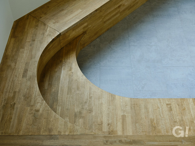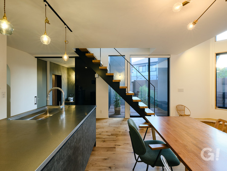 玄関三和土には外壁と同一素材の塗壁とアンティーク照明、現代的なガラス戸とヴィンテージのロッキングチェアと昔懐かしい踏み台、勾配天井と間接照明が印象的なピットリビングには収納も兼ねた曲線ベンチや木製窓枠、モルタル調のリビング床とオーク材のダイニング床、施主様お気に入りの様々な椅子が並べられたダイニングとステンレス天板のキッチン、力桁のストリップ階段とアーチゲートなどを組み合わせることで、ともすれば緊張感を感じさせるインダストリアルで硬質な空間をベースにしながらも、ノスタルジックで温かみのあるインテリアへと昇華しています。