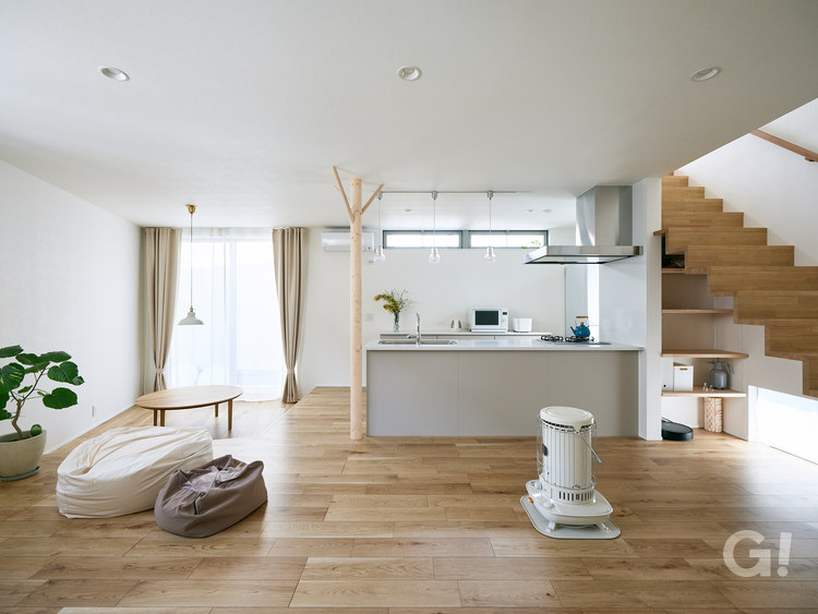 大きな木の幹をイメージした丸柱を中心に、リビングやダイニングの概念を無くした空間構成にしており、ご飯を食べたり本を読んだりテレビを見たりゴロゴロしたり、これらの行為を限定する家具や要素はなるべく取りのぞきながら、施主様がその時の気分に応じて好きな場所で好きな事を愉しめるようにしています。