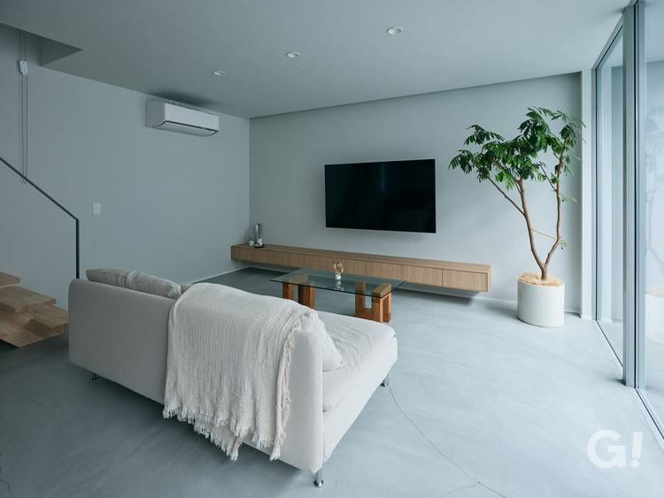床は珍しいモルタル塗りで仕上げていて、空間全体にひんやりとした質感にすることで、デザイナー家具や照明がアクセントとして引き立っています。