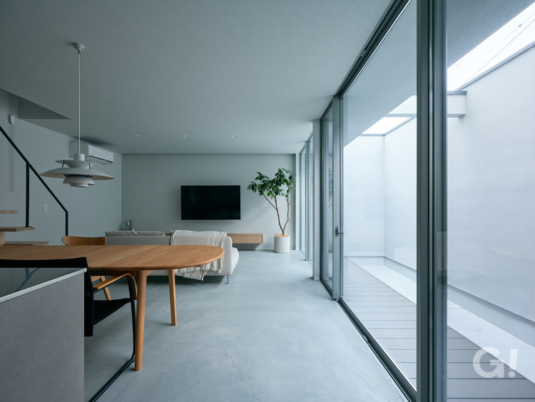 中庭との境界である壁をすべてガラス張りにして、床ピッタリ・天井ピッタリに仕上げています。天井は内部から外部へ迫り出したような構造で、ガラス建具が壁の代わりに天井を支えているように見せることで、とても軽やかに映っています。外部へと迫り出したような天井は、夏の暑さを和らげる庇として、また雨避けとしても機能する重宝な構造物です。電気やガスを使わないためエナジーフリーでメンテナンスフリー。とても優れた働き者です。
