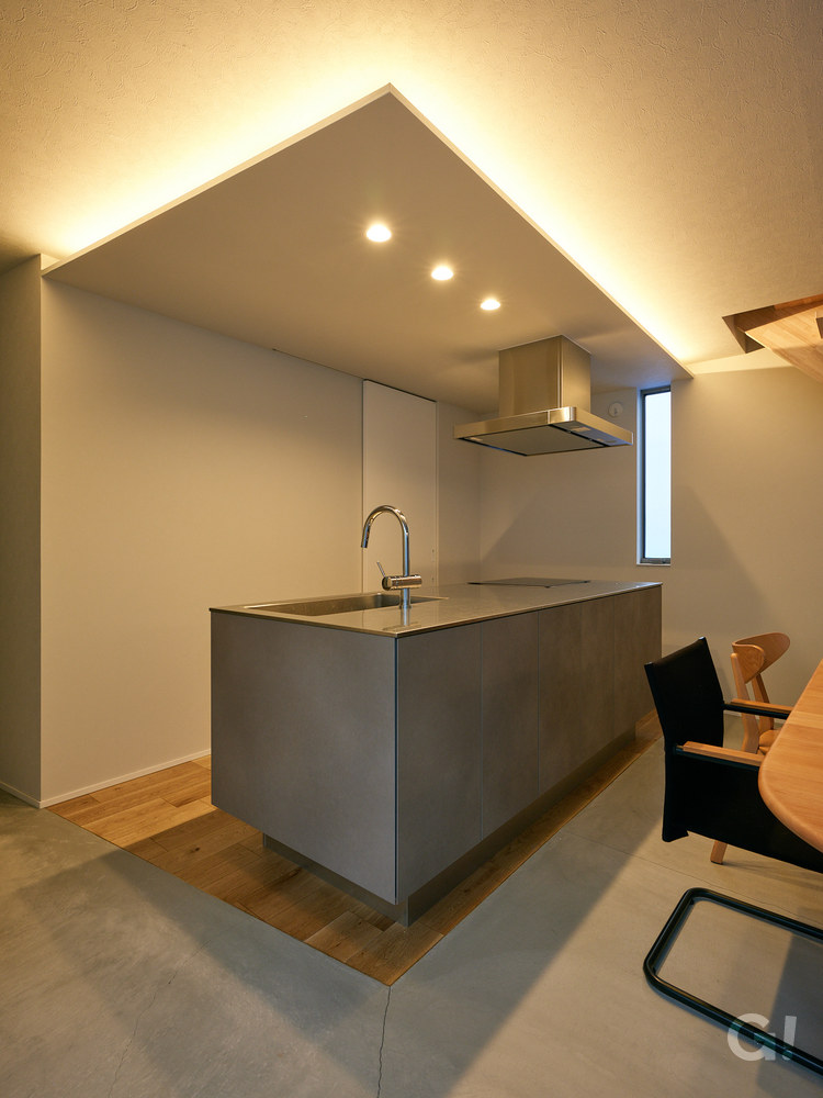 意匠面での面白い試みとしては、何箇所か斜辺を挿入していることです。平面図で見ると顕著に面白さが感じられますが、玄関・ホールからキッチンまで続く「斜めの線」を創って、壁・床・天井で連続させる、という表現をしています。(施主様には大いに気に入って頂けましたので、訪問者の方にはそっとご説明して下さると期待しています。)他にも立体的な「斜め」をいくつか組み込んで変化を楽しめるようにしています。その他にもひと工夫あります。プライバシーを守る独立壁を、建物本体からほんの15センチ切り離してスキマをつくり、「間」を取っています。屋内から見ると「光の筋」が中庭へと差し込んでアートな雰囲気になり、夜、道路を行き交う人から見ると、温かな光が外へと漏れ出して、とても大きなライン照明のようになり、「街灯」として町の人にも楽しんでもらえる仕掛けとなっています。