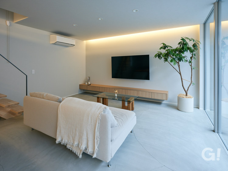 床は珍しいモルタル塗りで仕上げていて、空間全体にひんやりとした質感にすることで、デザイナー家具や照明がアクセントとして引き立っています。