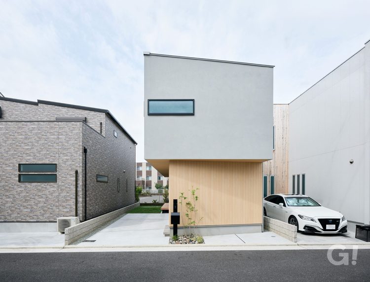 外観は、1階に木目を用いたあたたかみのある表情を、2階にはオーバーハングしたボリュームにグレーの塗り壁を合わせ、対比の中に心地よいバランスを創り出しています。この2つの素材が重なり合うことで、周囲に馴染みながらも存在感のある個性的なファサードにしています。