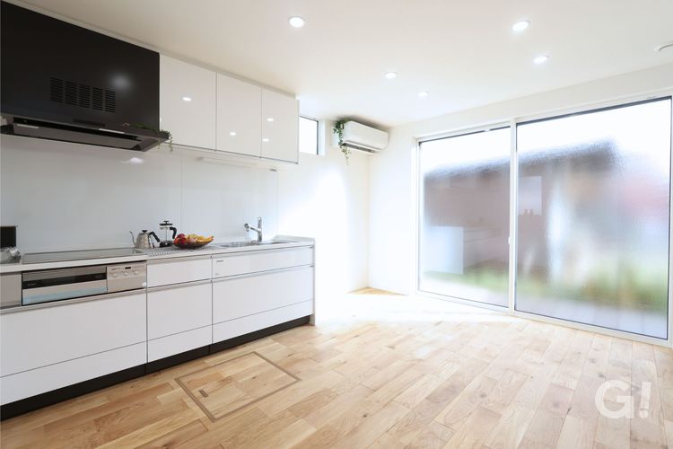 白を基調とした壁付けキッチンは清潔感たっぷりで、吊戸棚もあるので収納にも困りません。