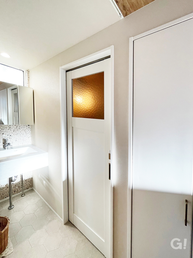 曲線が美しいR形状のニッチがアクセントとなり、すりガラスのドアがほどよい抜け感と愛らしさを添えます。
