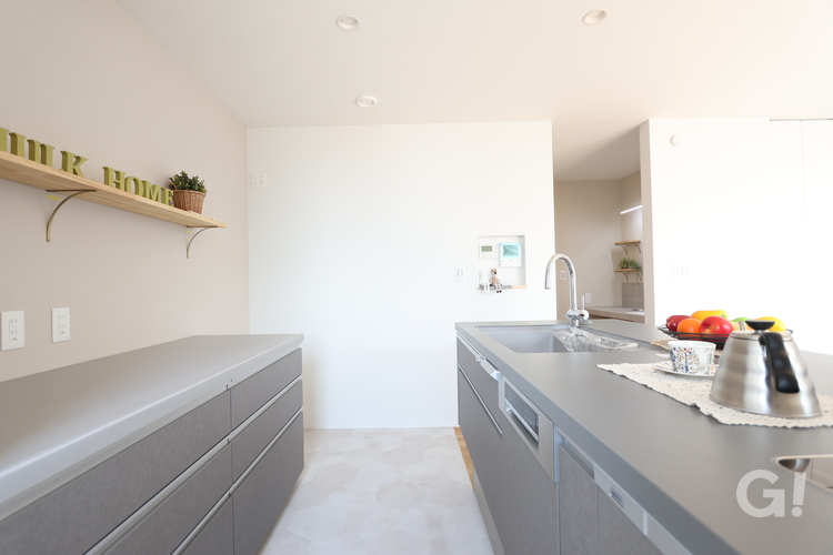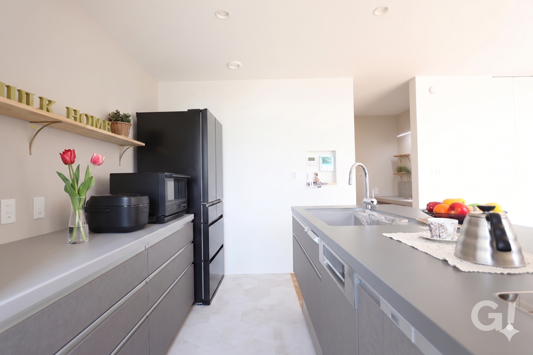 グレーを基調としたシンプルなフラットキッチンは、圧迫感のないすっきりとしたデザインです。
