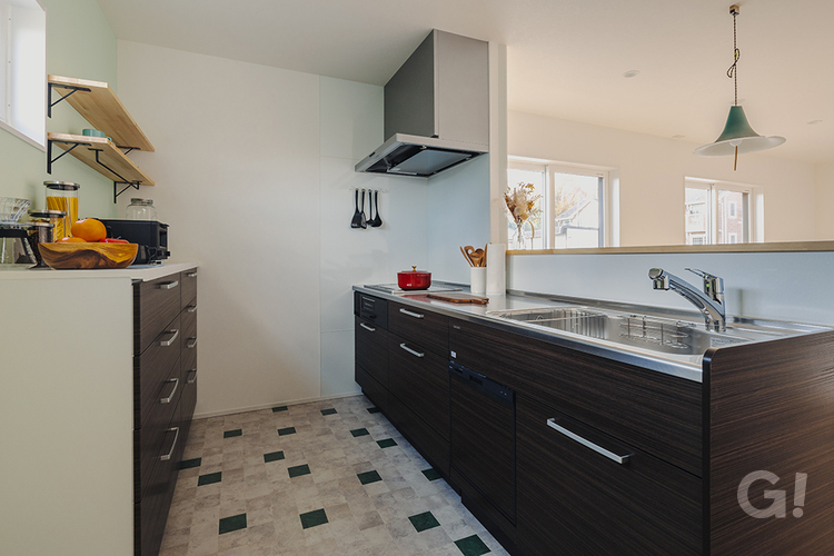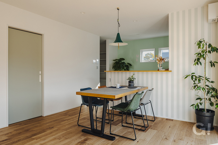 壁の一部にストライプ柄の壁紙を取り入れることで、縦方向の印象が強くなり、空間の広がりを感じられます。 アースカラー(地球や自然をイメージした落ち着いた色味)を要所要所に採用し、ずっと居たくなる居心地の良さを感じられるデザインに。