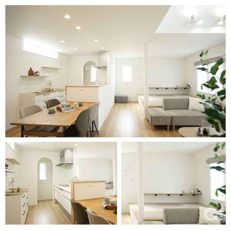 開放的なLDKに小上がりの和室 家族を笑顔にする家 広々とした、LDKには小上がり4.5畳の和室があり 吹抜けも開放的で明るいリビングになっています。 水回り→ファミクロ→キッチンと家事動線も考えた間取りとなっています。 もちろん、高断熱と高気密だから快適で過ごしやすく、省エネで 経済的な暮らしが実現できます!