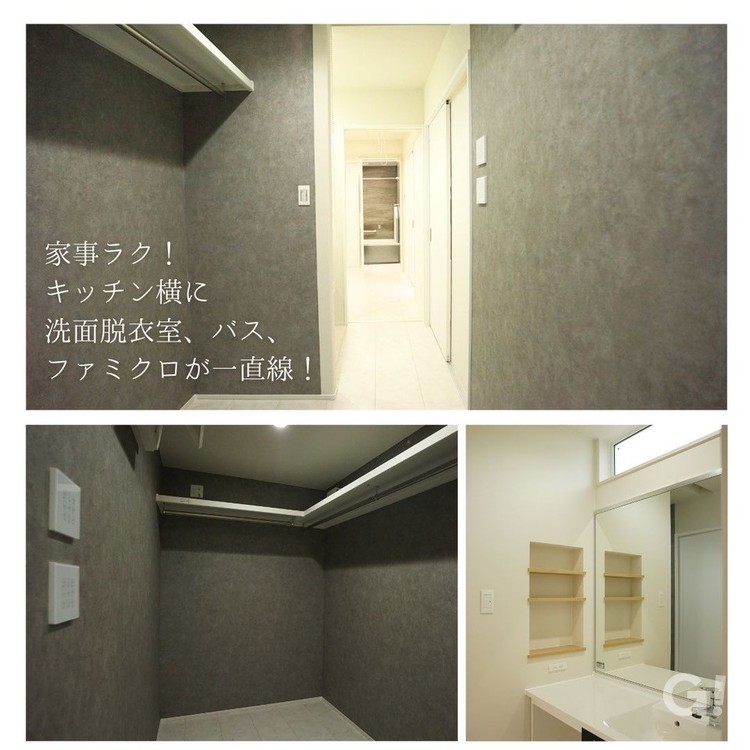 2. 究極の「家事ラク」を叶える水回りの集約 「家事の時間を、家族の時間に変えたい」 そんな想いを形にするため、キッチン・洗面・脱衣所・ランドリールームなどの水回りを一直線にまとめました。移動距離を最小限に抑えることで、日々の負担を大幅に軽減。平屋ならではの機能美を実現した動線計画です。